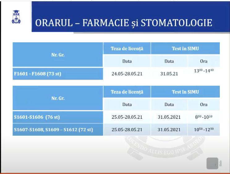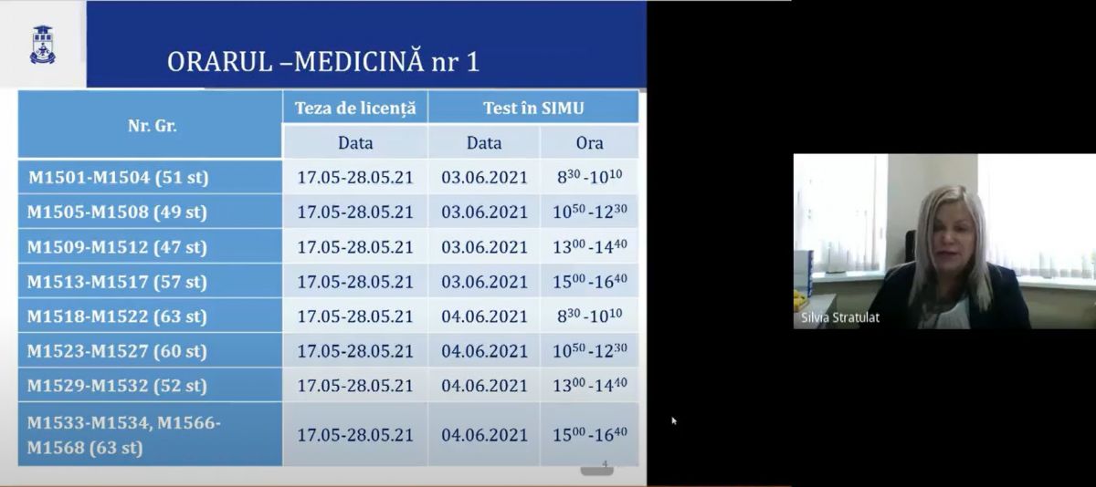 Silvia Stratulat, head of the Department of Teaching and Academic Management (DTAM), mentioned that the decision was dictated by the epidemiological situation in the country, and the similar experience of last year encouraged intentions in this regard. ”This method of assessment will allow us to comply with the health standards imposed by the authorities, so that the commission examines five students each day”, said the Associate Professor.